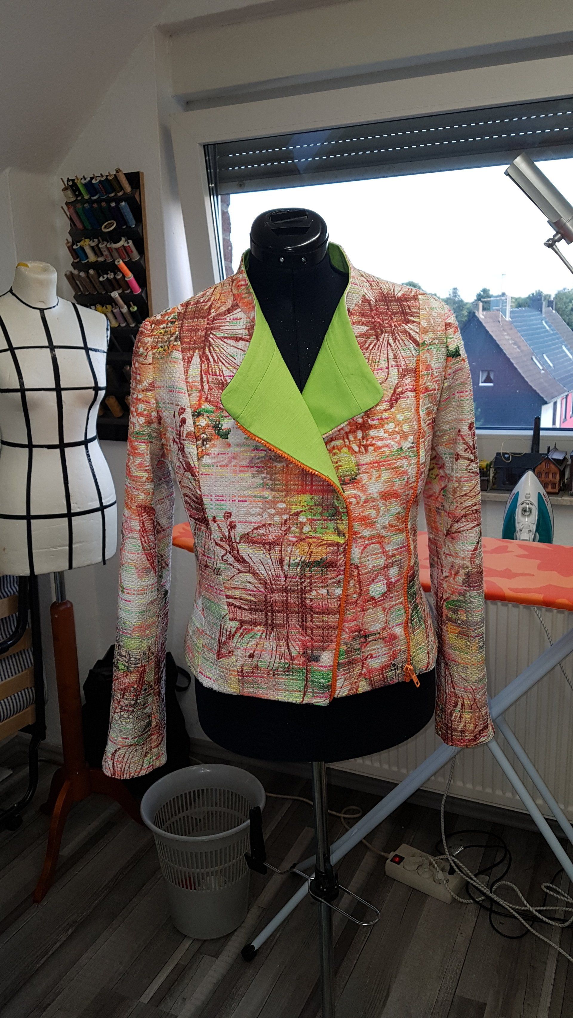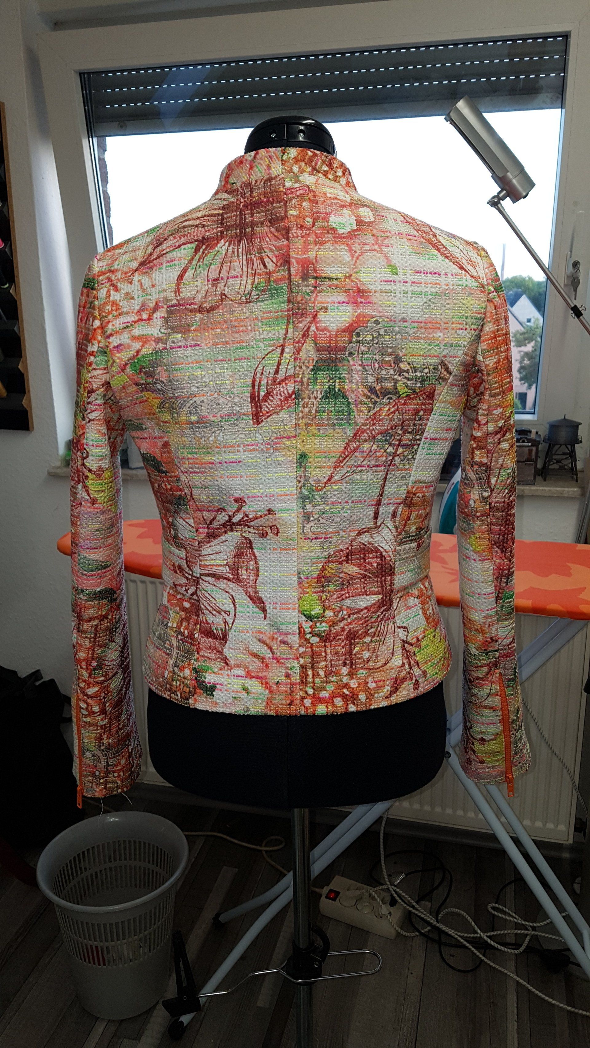 Bikerjacke aus Bouclé ähnlichen Webstoff mit floralem Print. Der sichtbare Beleg wurde aus Baumwollstoff gearbeitet. Das Innenfuter aus hochwertigen Polyestertaft. Der Reißverschluss in orange mit großen Zähnen.