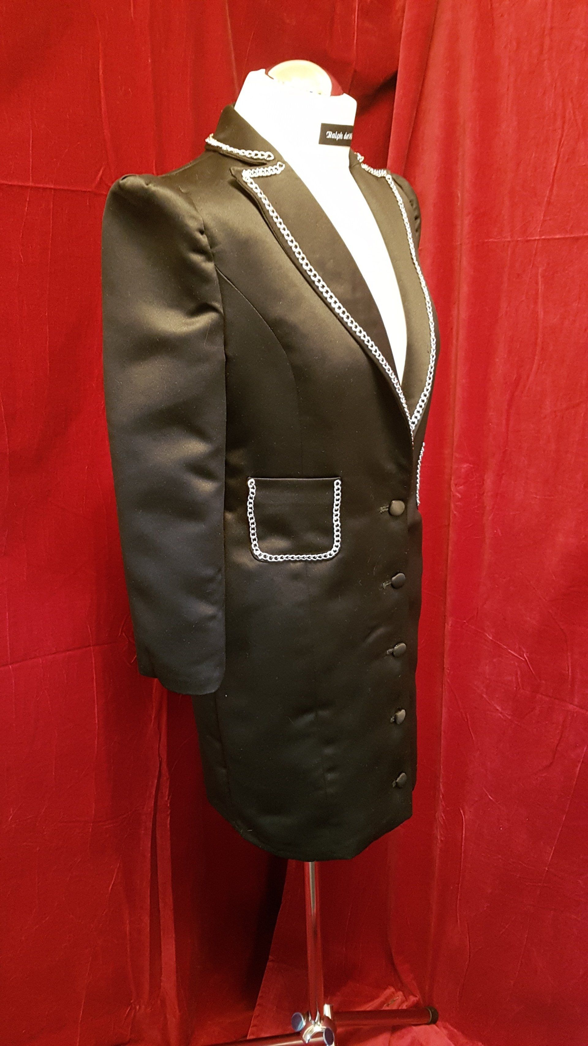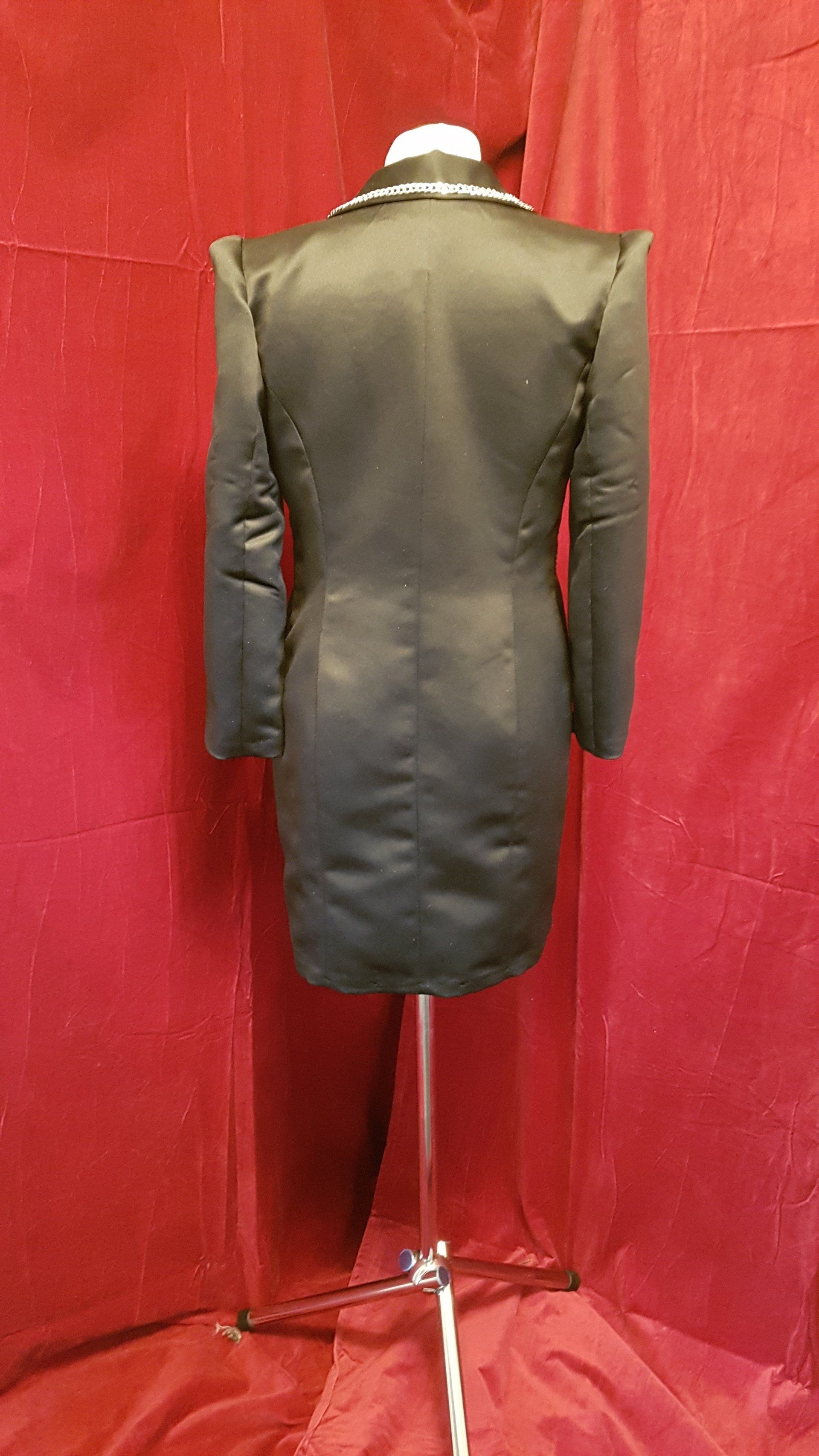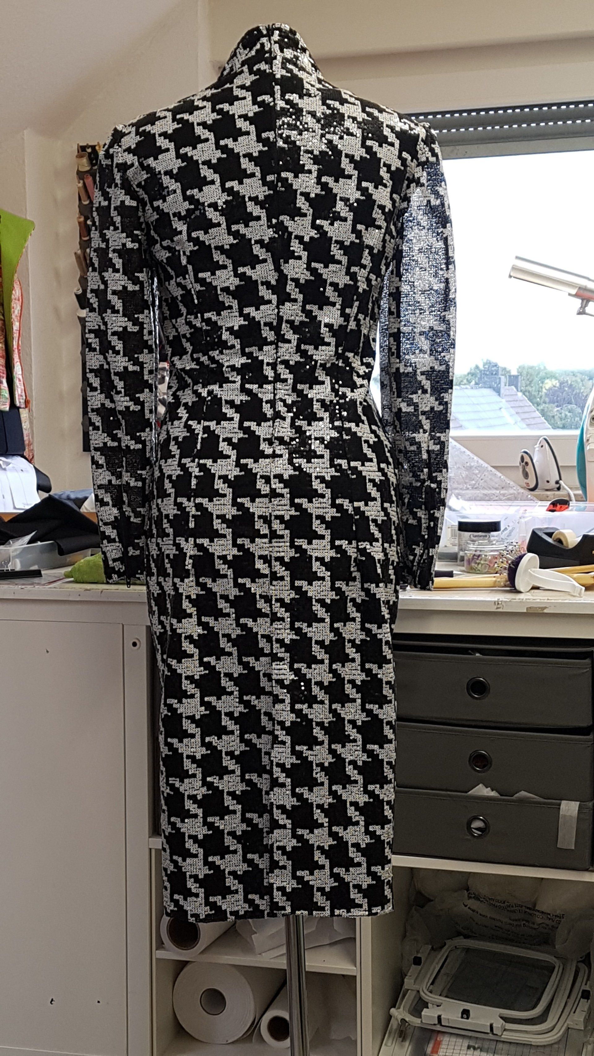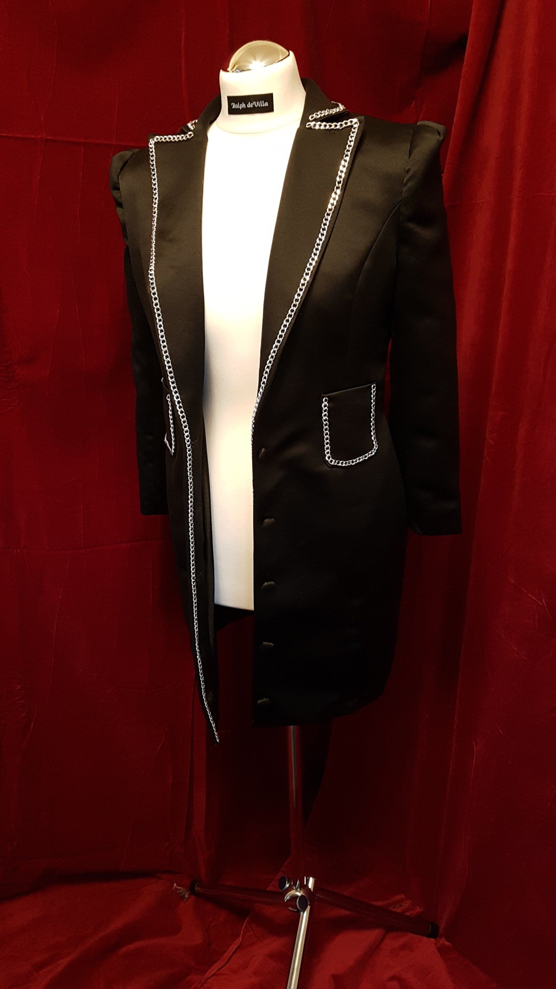 Hier präsentiere ich meine Variation eines extravaganten Blazerkleides. Das Grundmodell dieses Blazer-Kleides ist das Modell der Kurzjacke des zuvor dargestellten Kostüms im Chanel-Stil; mit Taschen. Es wurde auf die Länge eines Mini-Kleides verlängert. Als besonderes Accessoire wurde eine silberfarbene Panzerkette am Reverskragen und an den Taschen angebracht. Das Blazer-Kleid ist mit rauschendem Futter-Taft gefüttert; die Knöpfe mit dem Oberstoff (Brautsatin) bezogen.