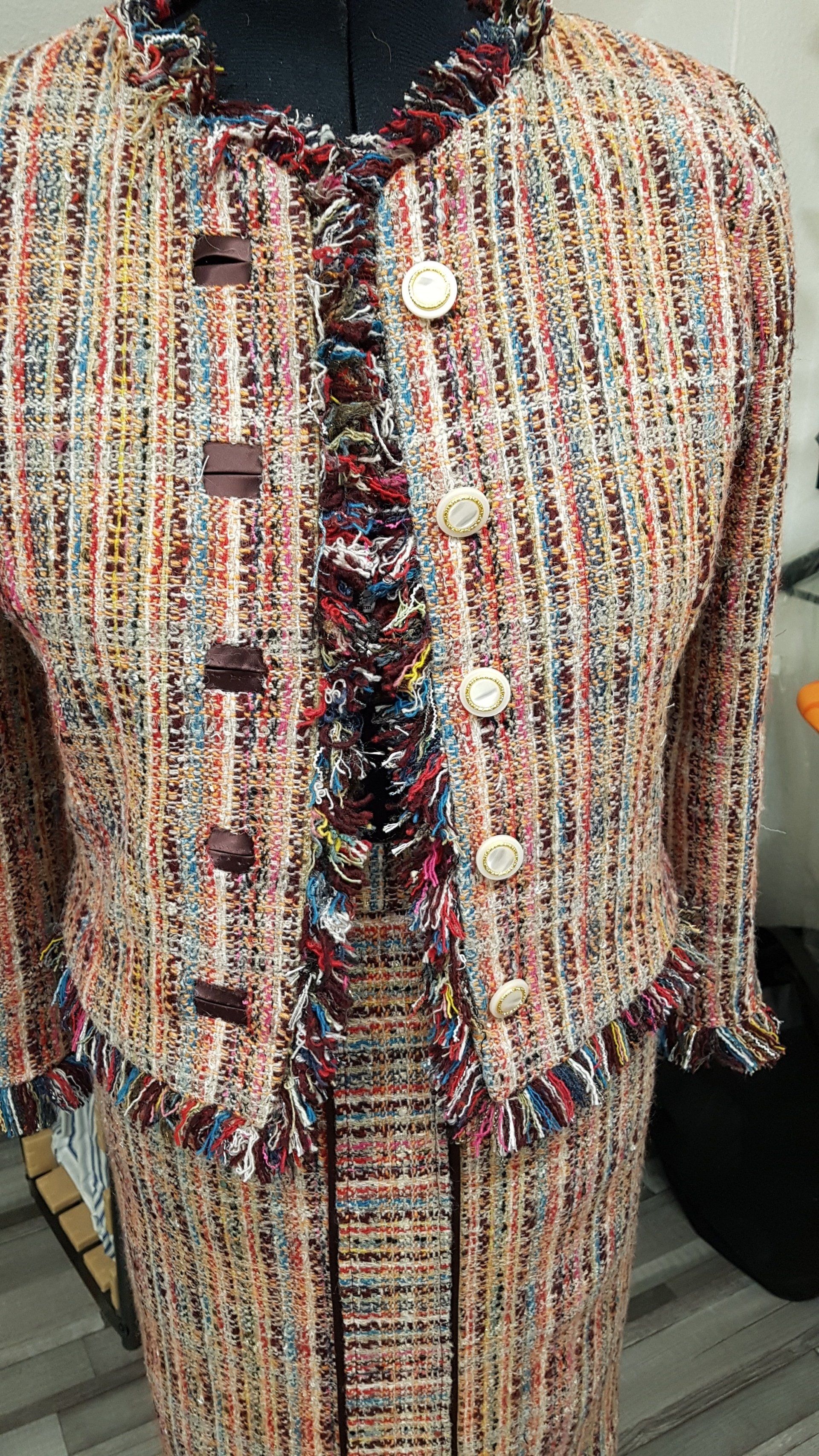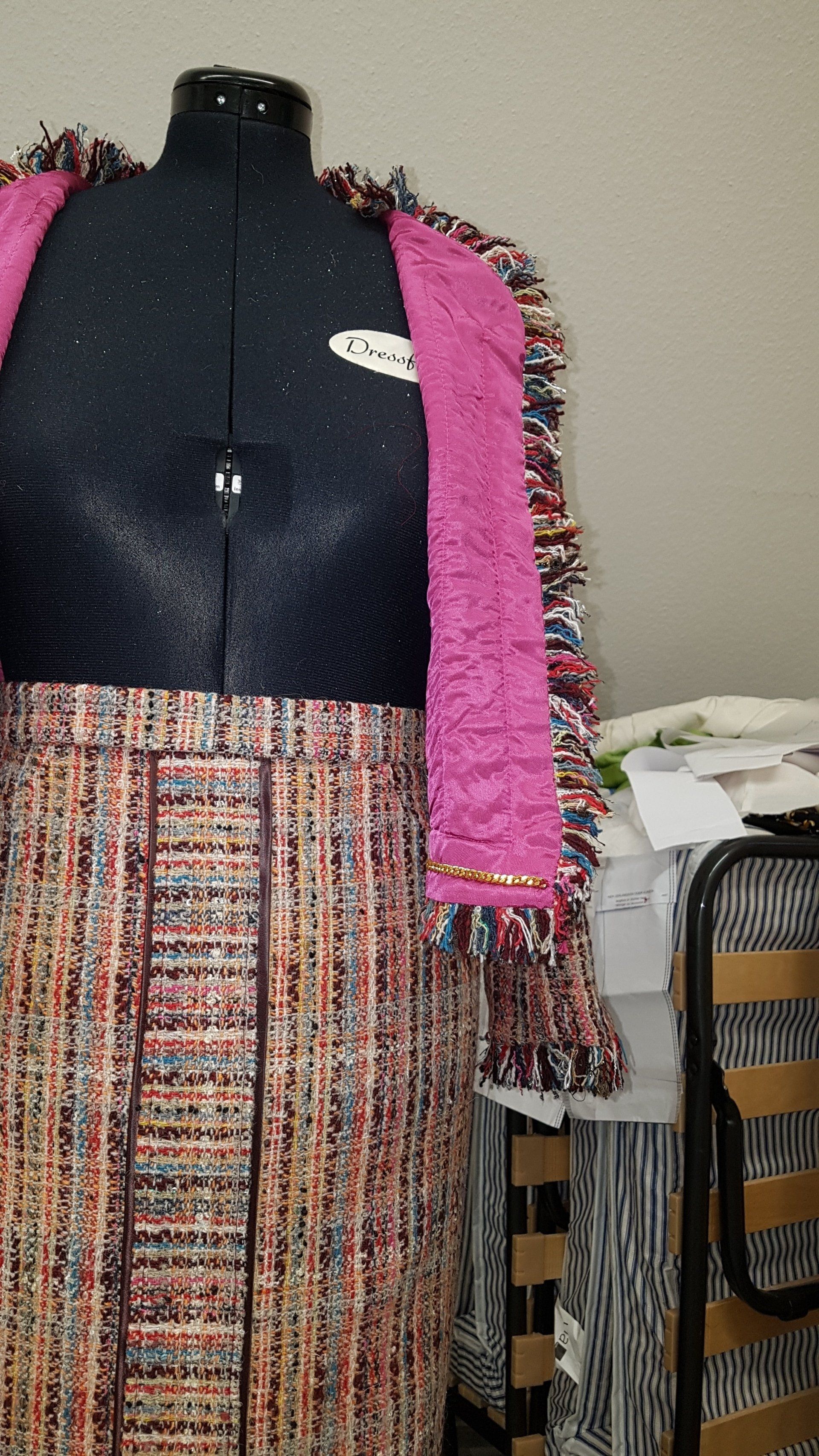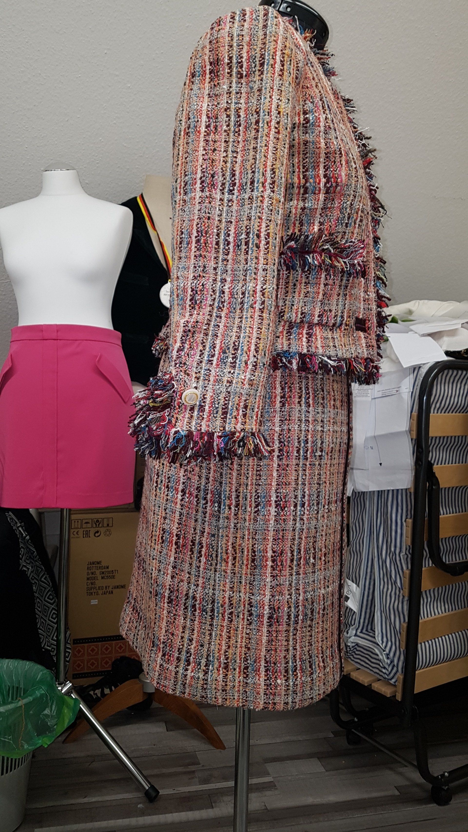 Obiges Modell wurde im Chanel-Stil mit den charakteristischen Accessoires (Fransenborte, gepaspelte Knopflöcher sowie Panzerkette am Innensaum der Jacke) angefertigt. Verwendete Materialien: Oberstoff Bouclé, Futter Taftstoff