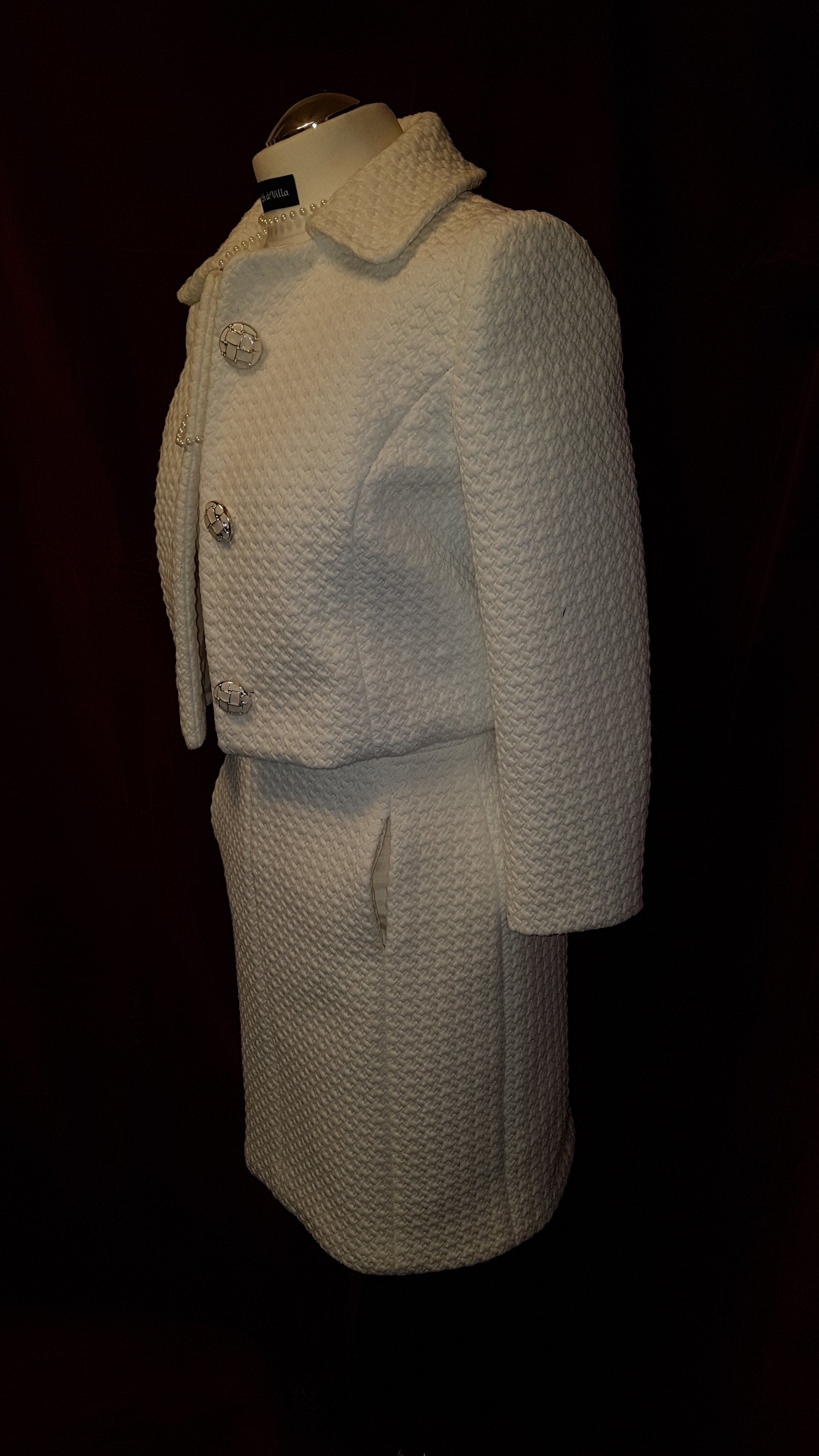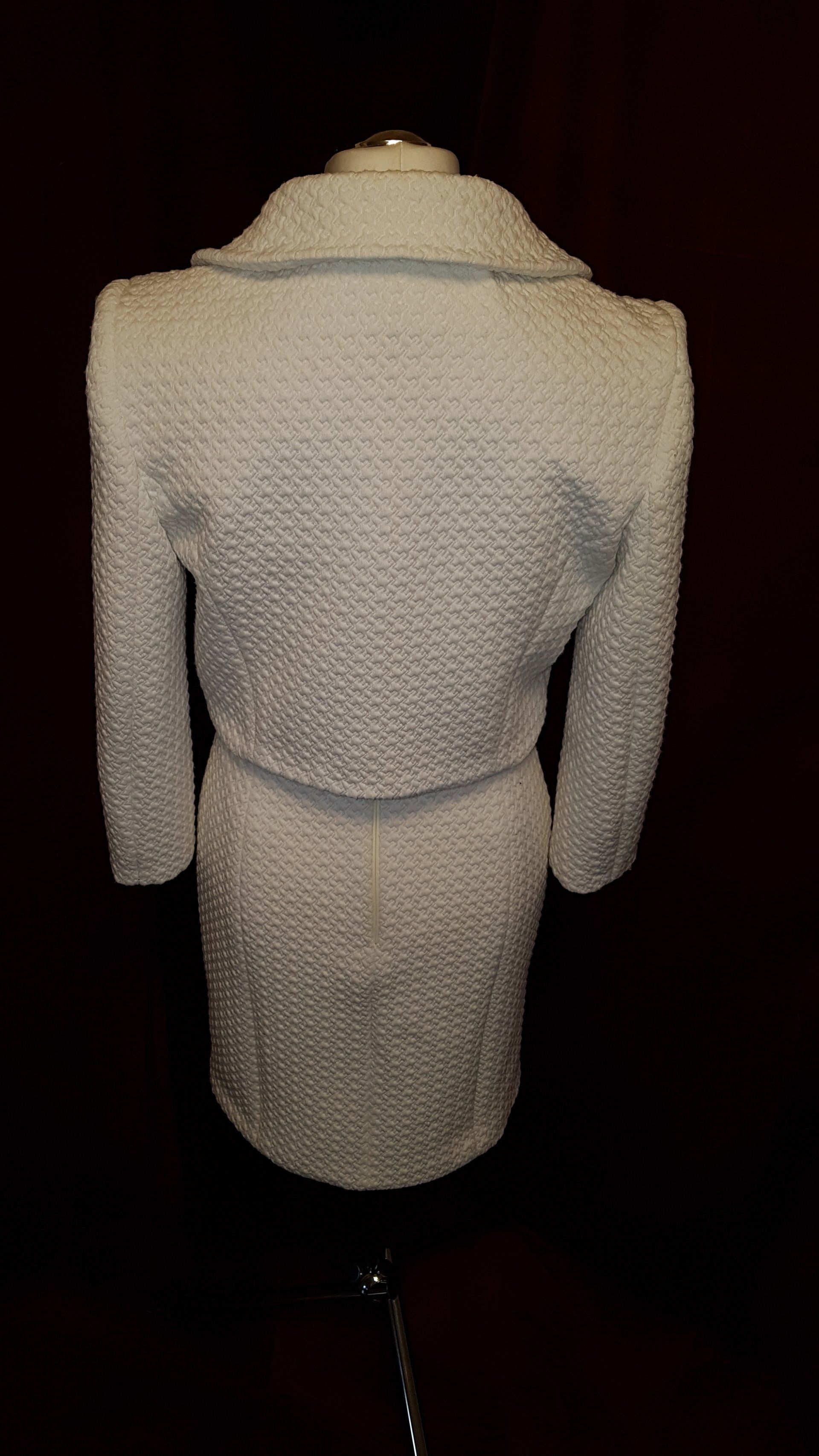 Angelehnt an das Kostüm im Chanel-Stil wurde das obige Modell kreiert. Im Kundenauftrag wurde auf die Fransenborte und die Taschen an der Jacke verzichtet. Die Jacke - entgegen der für dieses Modell untypisch - erhielt einen Flachkragen . Der aus 8 Bahnen bestehende Rock wurde mit einer Kängurutasche versehen; die Eingriffe sind in den vorderen Seitennähten versteckt .
