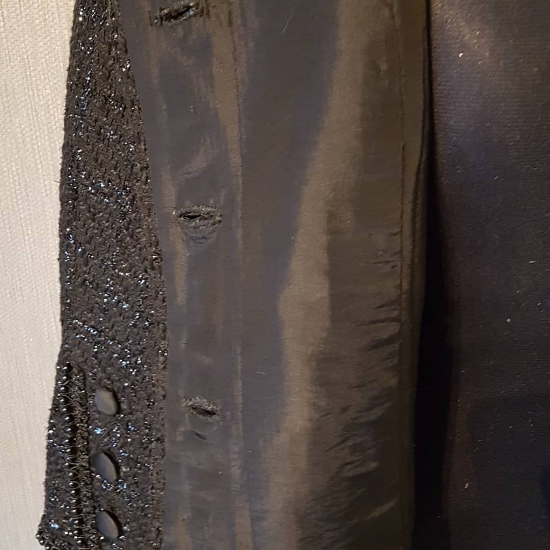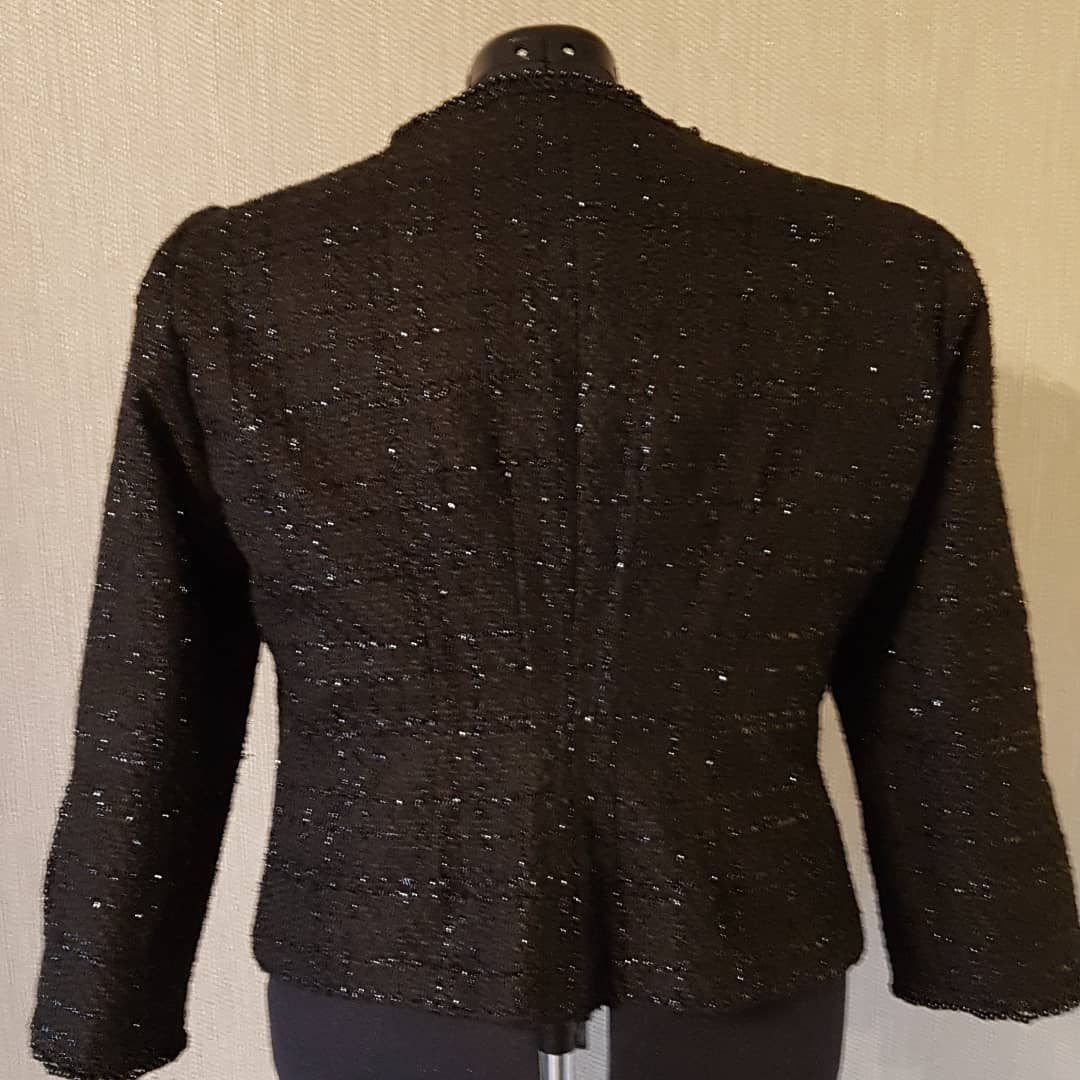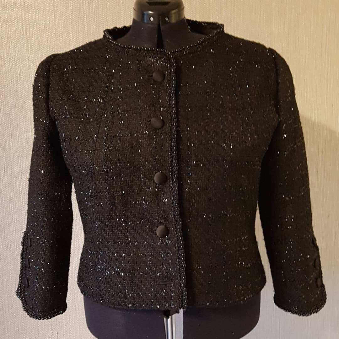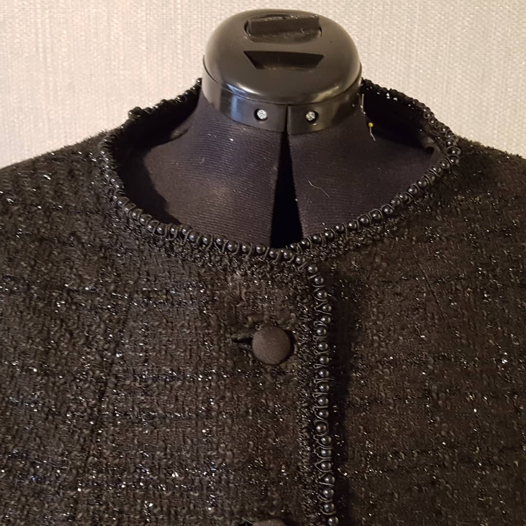 Jacke im Chanel-Stil. Dieses "kleine schwarze" wurde aus Bouclé-Stoff mit Metallicfäden gearbeitet. Futter aus hochwertigen Futtertaft, mit dem auch die Knöpfe bezogen wurden. Knopflöcher mit der Hand gestickt; statt einer Fransenborte wurde eine Perlenborte angenäht.